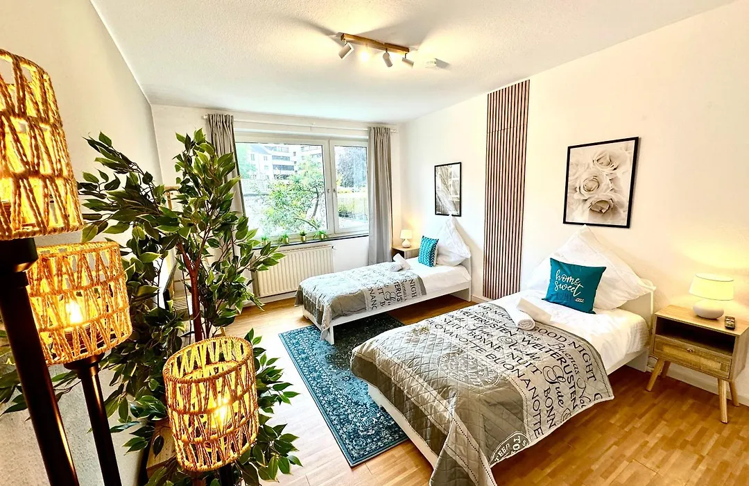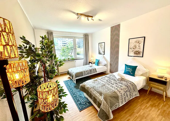 Die 66 m^2 große Ferienwohnung Pempelfort, Zentral, Balkon, Zu Fuss Zur Koe & Stadt, Netflix befindet sich im Stadtteil Pempelfort von Düsseldorf und bietet einen Ausblick auf den Garten.